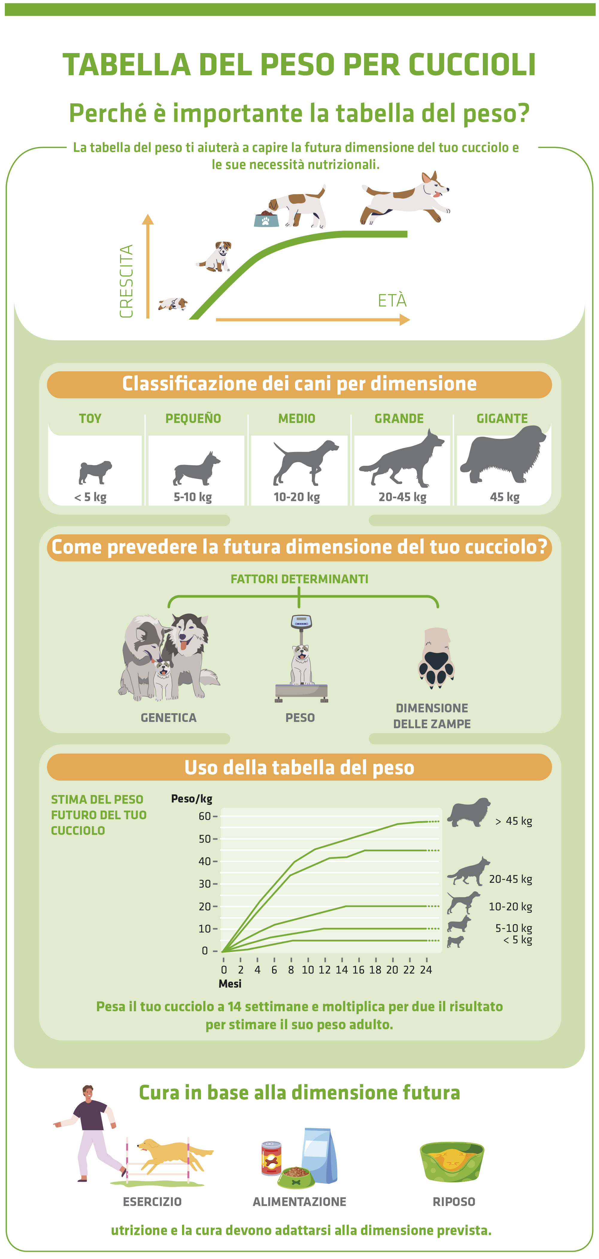 Facciamo un esempio: supponiamo che un cane pesi sei chili a tre mesi e mezzo. Da adulto raggiungerà circa i dodici chili e sarà quindi una futura taglia media.