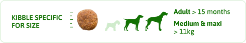 Dehydrated lamb proteins 14.5%, whole maize* 14%, maize meal "fioretto"*, dehydrated peas*, maize protein, rice middlings, lard*, lamb* 4%, brown rice* 4%, linseed*, hydrolysed pea protein, rice*, maize oil, pea protein*, minerals, dried chicory root concentrate (source of inulin)* 0.8%, lignocellulose, dried pineapple stem concentrate* 0.1%, spirulina (Arthrospira platensis)* 0.02%. *Natural ingredients.